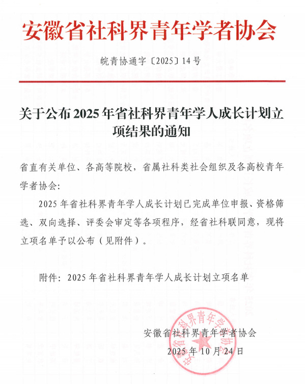近日,安徽省社科屆青年學(xué)者協(xié)會公布了2025年省社科界青年學(xué)人成長計劃立項結(jié)果,我院楊穎、張潔、孫佳、郭琪、王寧五名青年教師獲批立項。