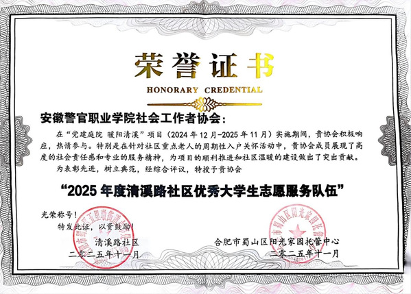 近日,“星光不負,禮贊擔當——暖陽志愿服務隊年度表彰會”在合肥市清溪路社區順利召開。安徽警官職業學院社會工作者協會因全年扎實的社區服務表現和突出貢獻,榮獲“2025年度清溪路社區優秀大學生志愿服務隊伍”稱號。
