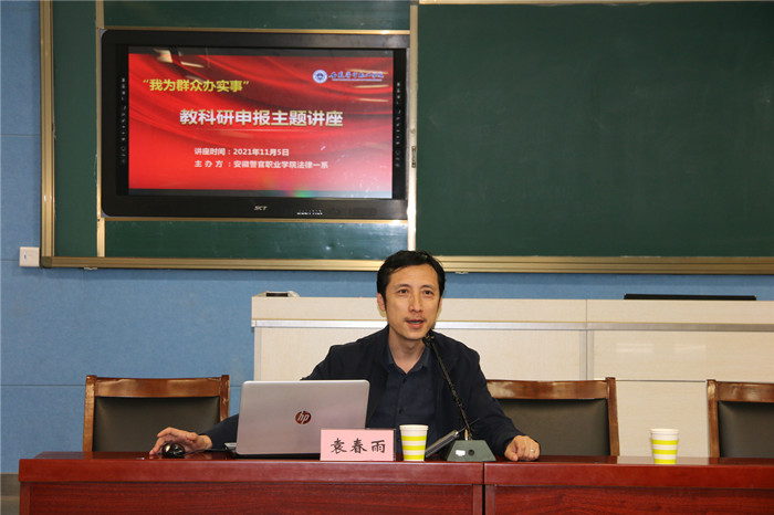 11月5日14:50分,法律一系第一場(chǎng)教科研申報(bào)主題講座開講!來(lái)自安徽職業(yè)技術(shù)學(xué)院科研處處長(zhǎng)、安徽省信息管理“高級(jí)雙師型”教師袁春雨教授擔(dān)在1號(hào)樓4樓錄播室為法律一系全系及院內(nèi)其他系部近70名教師做了一場(chǎng)精彩的講座。