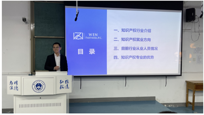 隨后,澤洋律師以知識產權行業介紹與職業發展為題,注重用數據說話,深度剖析行業案例,緊密結合自身工作經歷與感悟,分別從知識產權行業介紹、就業方向專業優勢目前行業從業人員情況四個方面展開講解。同時,他與在座同學們互動交流的過程中,分享了個人專業學習的經驗與方法,大大激發了學生們的學習熱情,堅定了專業學習信心,明確了未來學習的方向與目標。(王蔚)
