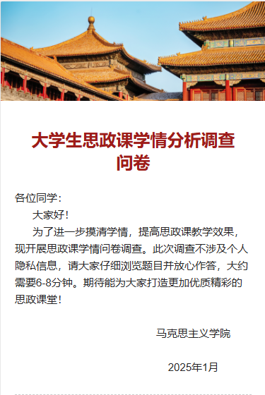為深入了解思政課教學實效,精準把握學生學習需求,提高思政課的針對性與吸引力,近日馬克思主義學院面向全體大一學生組織了一場思政課學情分析問卷調查活動。