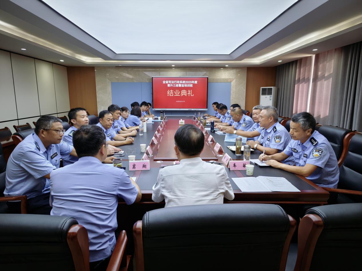 8月18日上午,全省司法行政系統2025年度晉升三級警監培訓班結業典禮在繼續教育學院舉行,繼續教育學院負責同志、警訓科工作人員和全體學員參加。