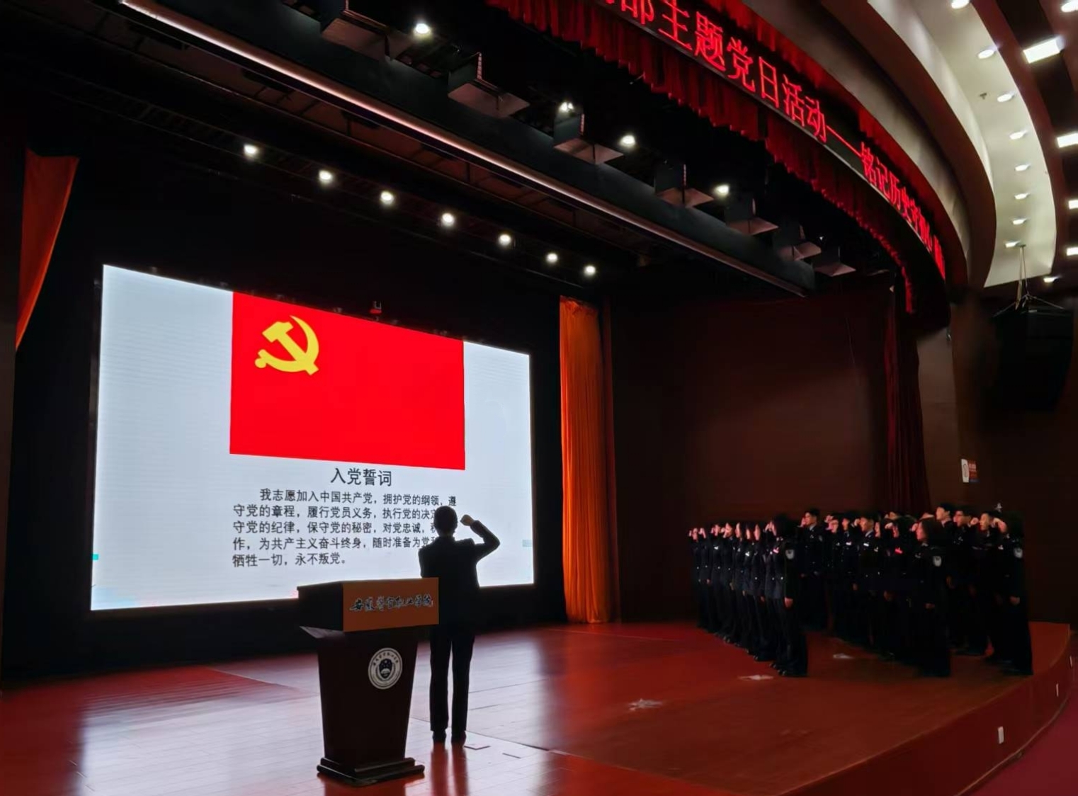 伴隨著激昂的《中華人民共和國國歌》,黨員教師程柏喬作為領誓人,帶領預備黨員舉起右拳,面向黨旗莊嚴宣誓,錚錚誓言鏗鏘有力,彰顯新黨員堅定的理想信念。